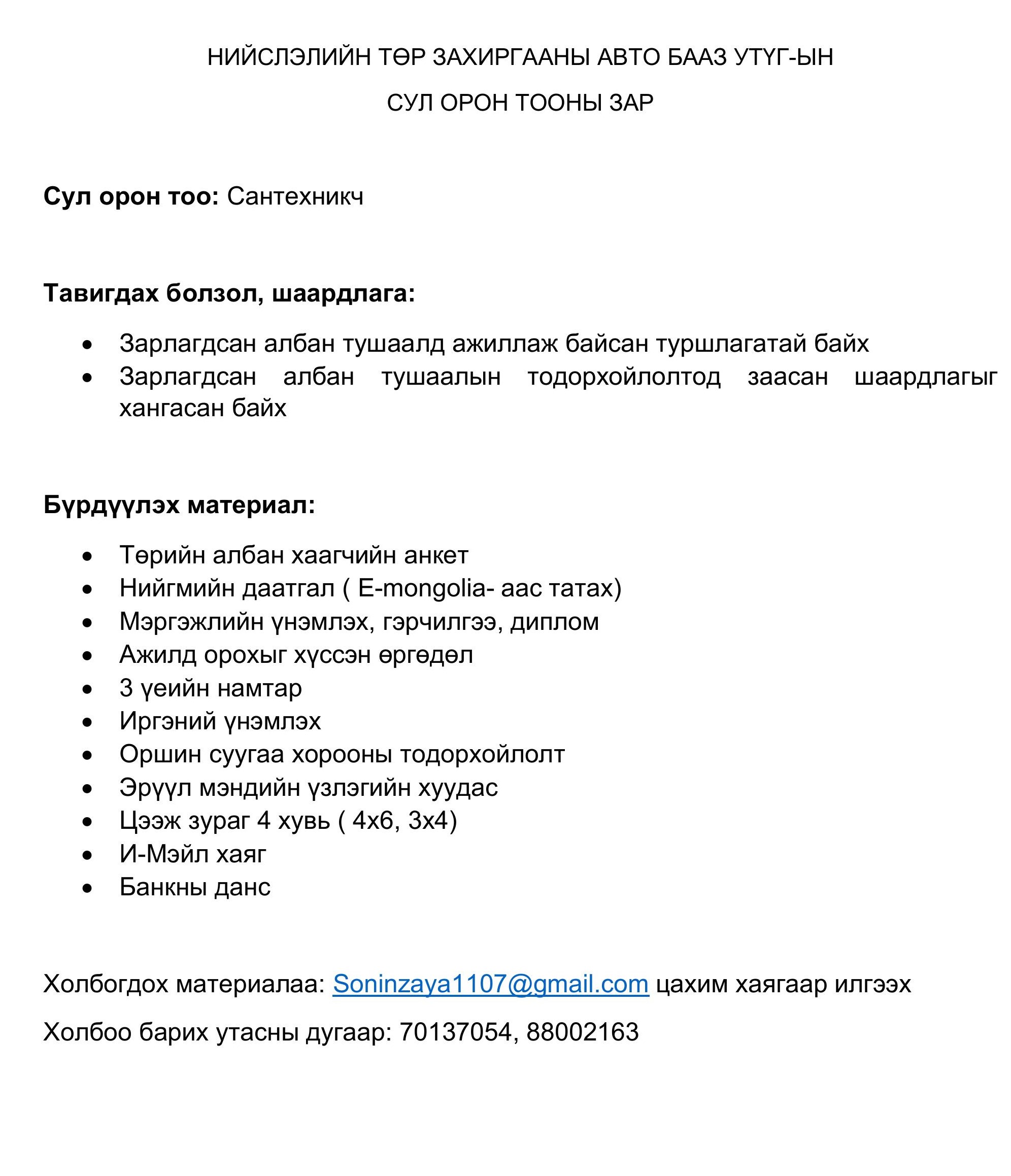 НЭЭЛТТЭЙ АЖЛЫН БАЙР (САНТЕХНИКЧ)