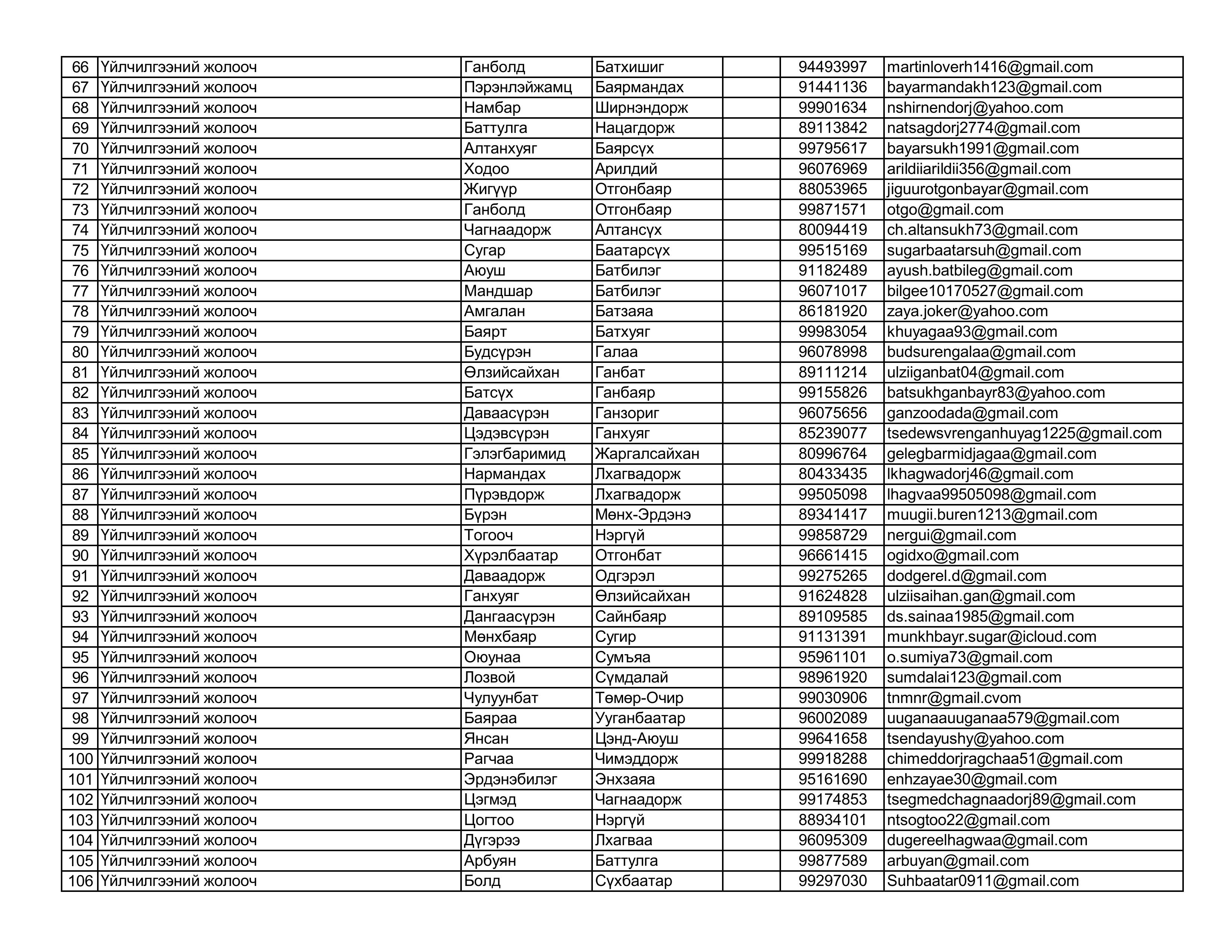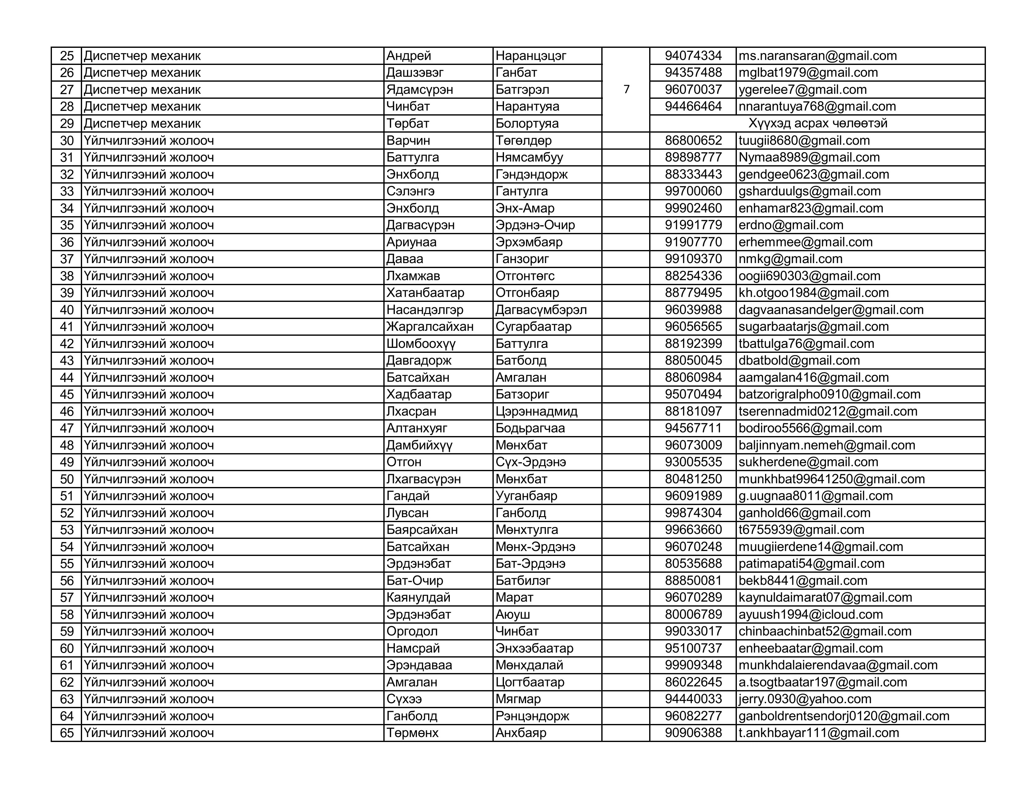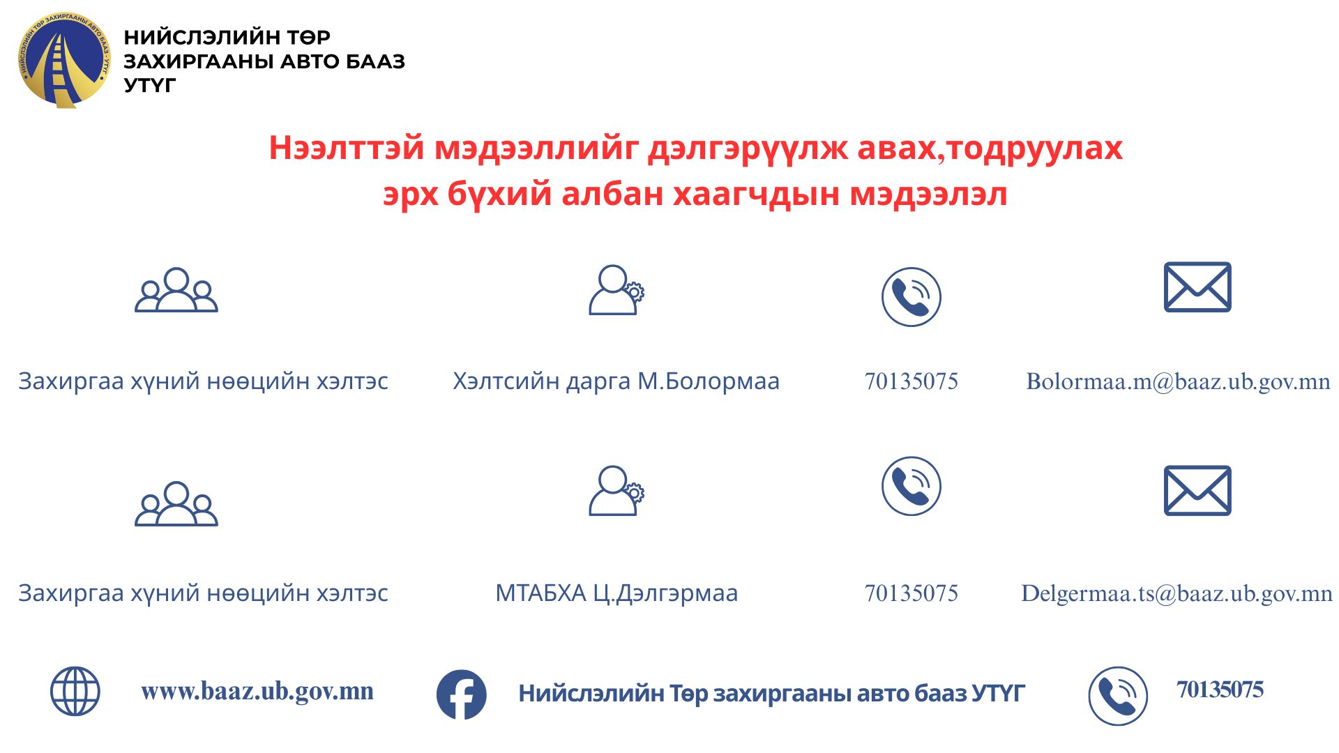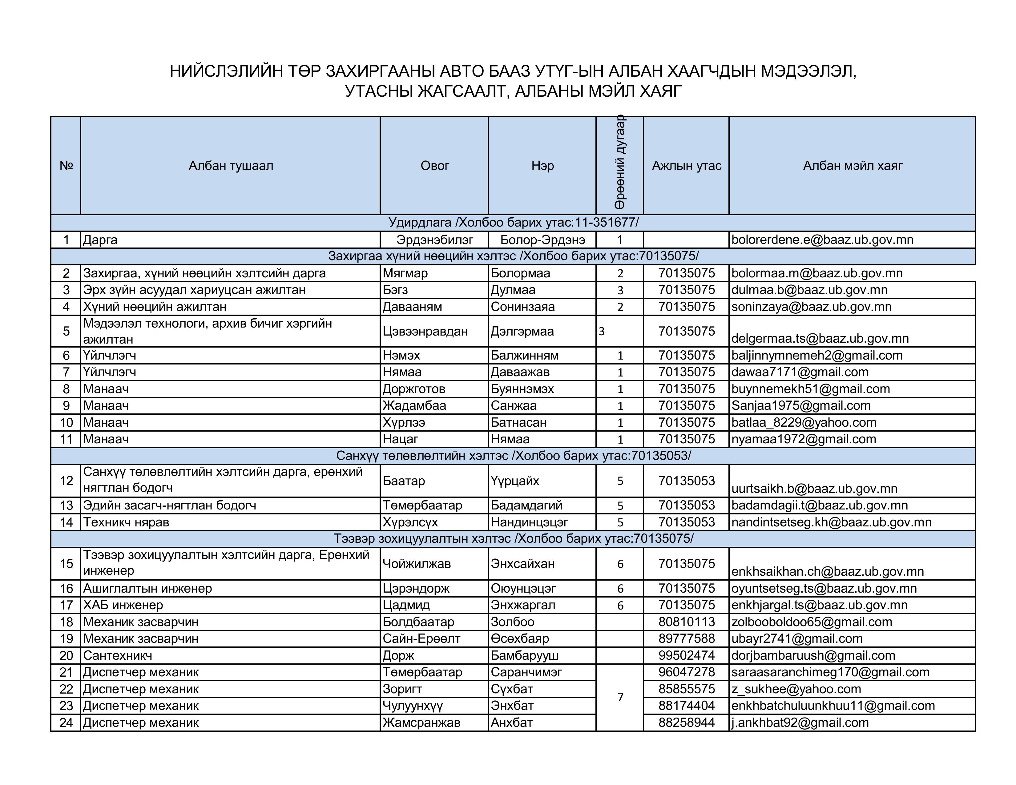 НИЙСЛЭЛИЙН ТӨР ЗАХИРГААНЫ АВТО БААЗ УТҮГ-ЫН АЛБАН ХААГЧДЫН МЭДЭЭЛЭЛ, УТАСНЫ ЖАГСААЛТ, АЛБАНЫ МЭЙЛ ХАЯГ